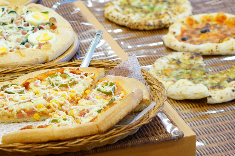 石窯で焼き上げた特製ピザ。トッピングに合わせたパン生地も特徴です。